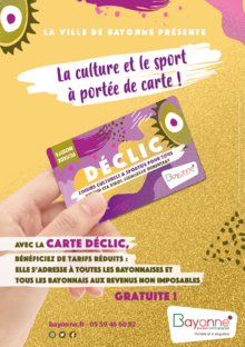 Mon compte Mes accès rapides Naviguez comme vous êtes Jeune Famille Senior Nouvel arrivant Parent Association Touriste Entrepreneur Associations, BrochureCarte déclic 1 documentPublié le 08 août 2025 Avec la carte Déclic, délivrée gratuitement aux Bayonnaises et Bayonnais non imposables, la Ville de Bayonne rend la culture et le sport accessibles à tous.Carte declic 2025 2026 (.pdf, 7,6 Mo) Télécharger Feuilleter Toutes les publications