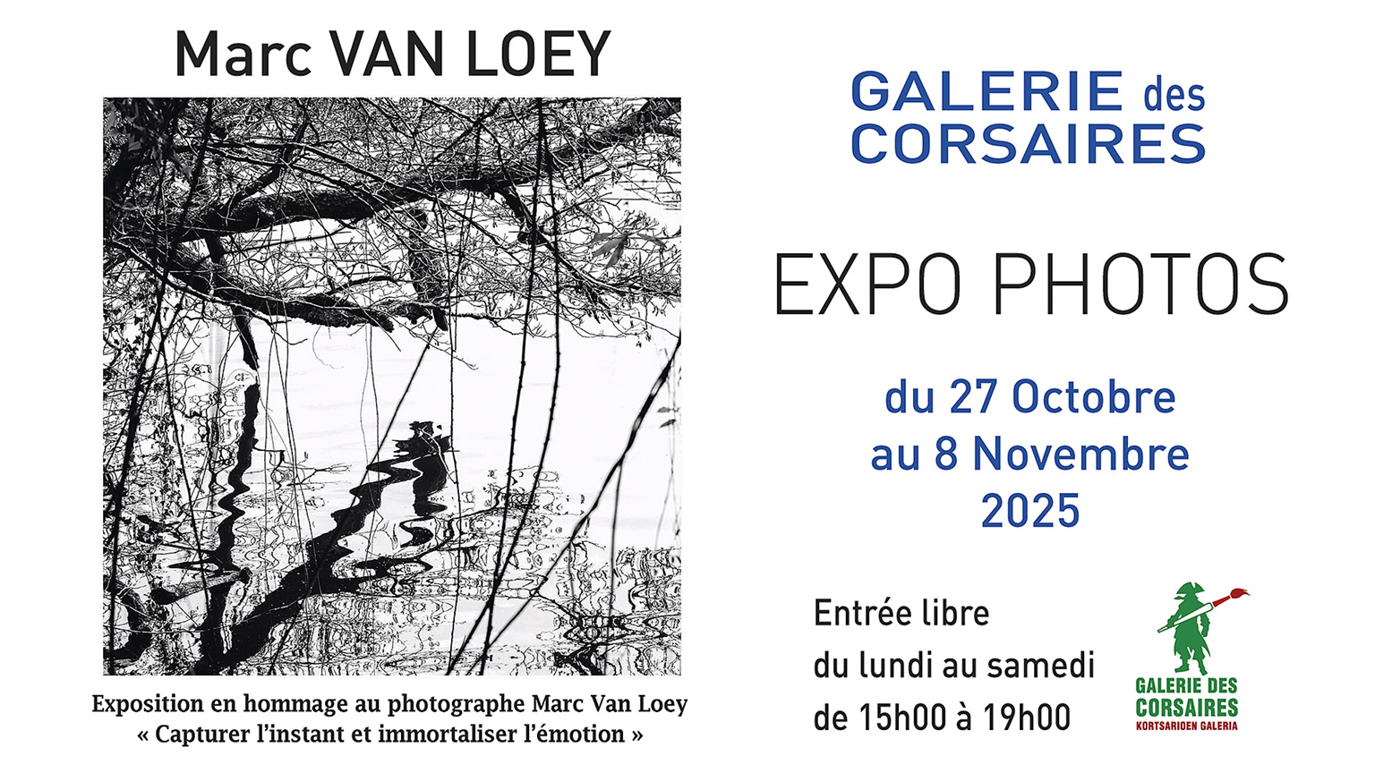 Mon compte Mes accès rapides Naviguez comme vous êtes Jeune Famille Senior Nouvel arrivant Parent Association Touriste Entrepreneur De27oct.à08nov.De 15:00 à 19:00 Adresse: Galerie des Corsaires16 Rue Pontrique64100 BAYONNE Ajouter à mon calendrierExpositionPhotographie Argentique à La Galerie des CorsairesHommage à Marc Van Loey. "Capturer l'instant et immortaliser l'émotion" Non organisé par la Ville de Bayonne Public : Tout publicRenseignementsContact : Galerie des CorsairesTél. : +33 6 46 46 79 91 Site Internet Courriel FacebookInstagramVernissage le Vendredi 31 Octobre à partir de 18h. © M. Van Loey Marc Van Loey. "Capturer l'instant et immortaliser l'émotion"L'exposition en hommage à Marc Van Loey nous plonge dans l'univers de ce photographe talentueux dont les images saisissent l'instant avec une grande sensibilité. © M. Van Loey Son travail s'est construit au fil des années guidé par l'inspiration qu'il trouvait au cours de ses voyages et rencontres. © M. Van Loey Une ombre, une ligne, un contraste, une matière ou un regard : un rien prend sous son objectif une allure d’œuvre d'art. © M. Van Loey En explorant cette exposition, nous nous offrons une parenthèse délicate, un moment suspendu à travers la poésie de son œil émérite. Entrée libre du Lundi au Samedi de 15h à 19h. © Galerie des Corsaires / Marc Van Loey Localiser Localiser Galerie des CorsairesPrécédentTout l'agendaSuivant