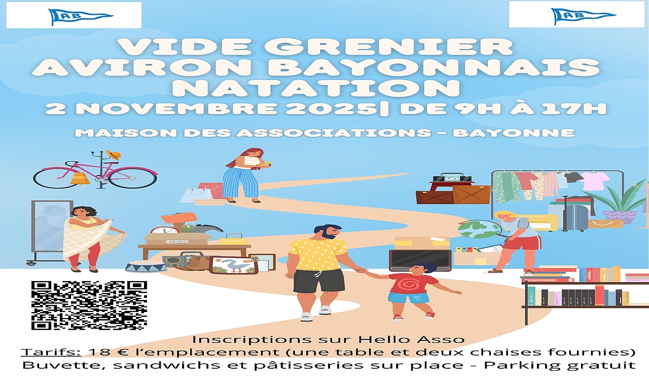 La section natation de l'Aviron Bayonnais organise son vide-grenier le dimanche 2 Novembre 2025 à la Maison des Associations de Bayonne (salle chauffée, tables et chaises fournies, parking gratuit, petite restauration sur place) de 9h à 17h. Non organisé par la Ville de Bayonne
