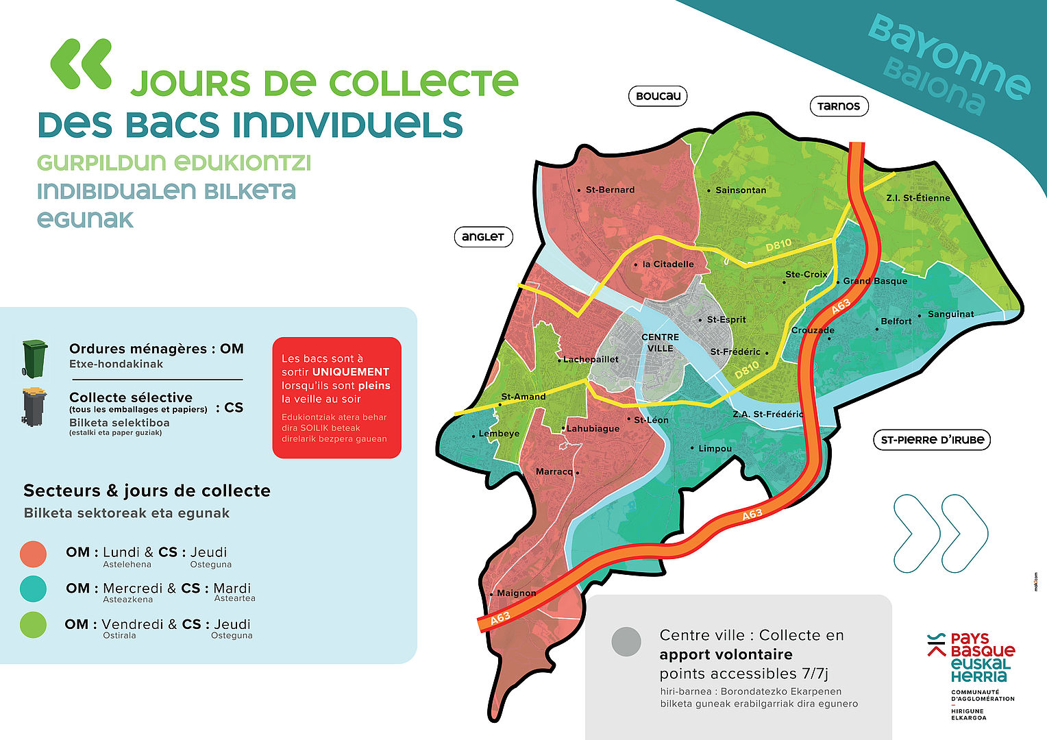 Pour les résidents des quartiers hors centre-ville de Bayonne, la collecte en porte à porte se fait en fonction de jours et d'horaires modifiés par rapport à ce qui se pratiquait jusqu'alors (carte).